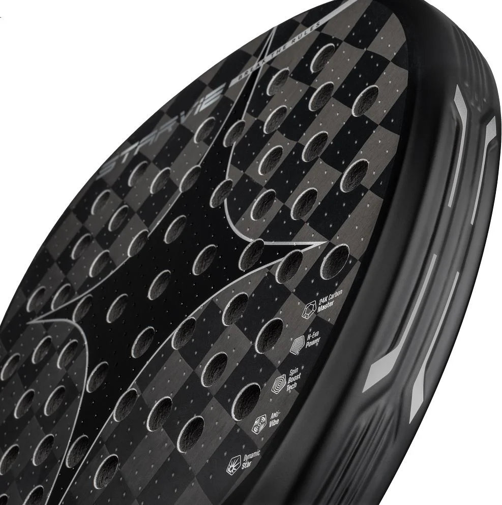 La surface est composée de 24K Carbon Master, qui assure une réponse explosive et précise de la balle. Le noyau est fabriqué en mousse H-EVA Power, un caoutchouc rigide qui apporte fermeté et puissance dans chaque frappe. Le cadre présente un profil à cinq côtés, ce qui augmente la rigidité et la stabilité.